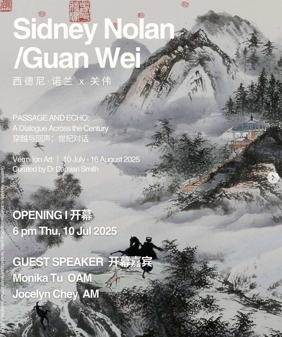 In this captivating exhibition, Guan Wei reimagines Australia’s iconic Ned Kelly in a Chinese landscape—where his armour and silence merge with mountains formed by ink and cloud. The exhibition brings to life a vision that began when Guan Wei, at just 18, first encountered Nolan’s Ned Kelly and imagined this unexpected cultural fusion.
