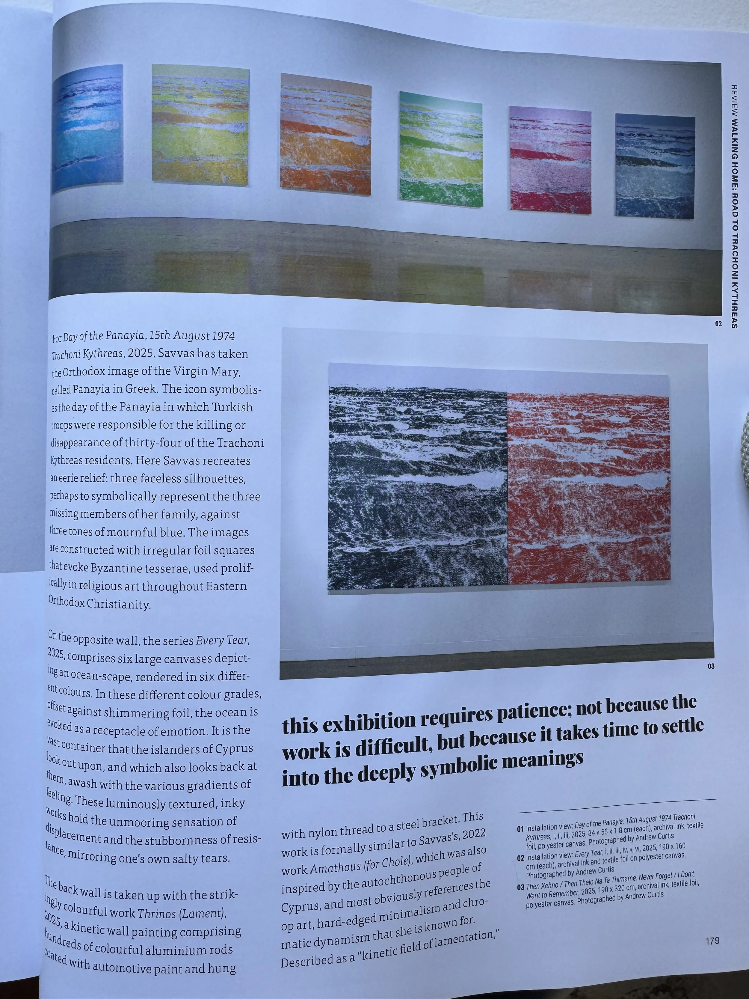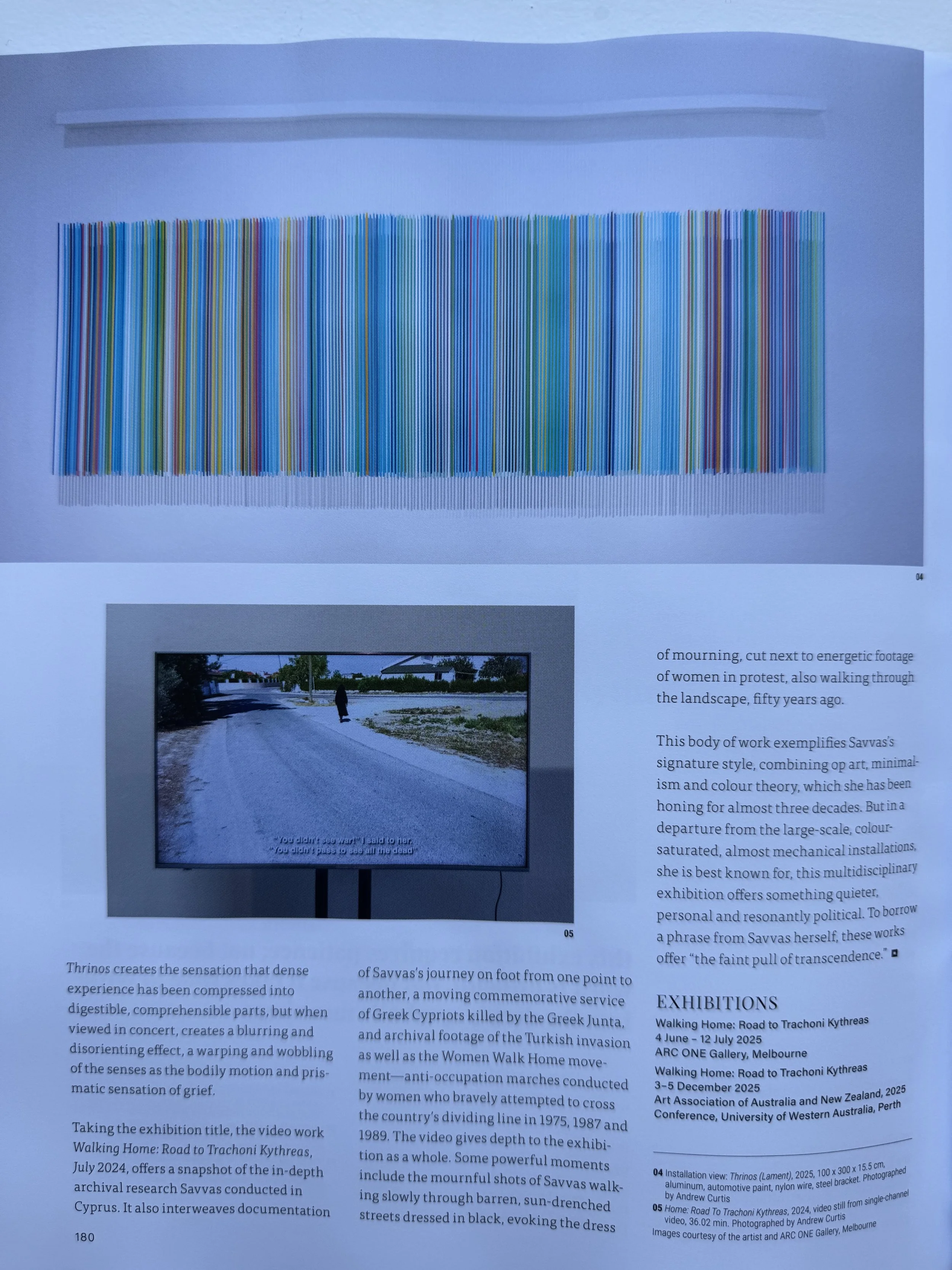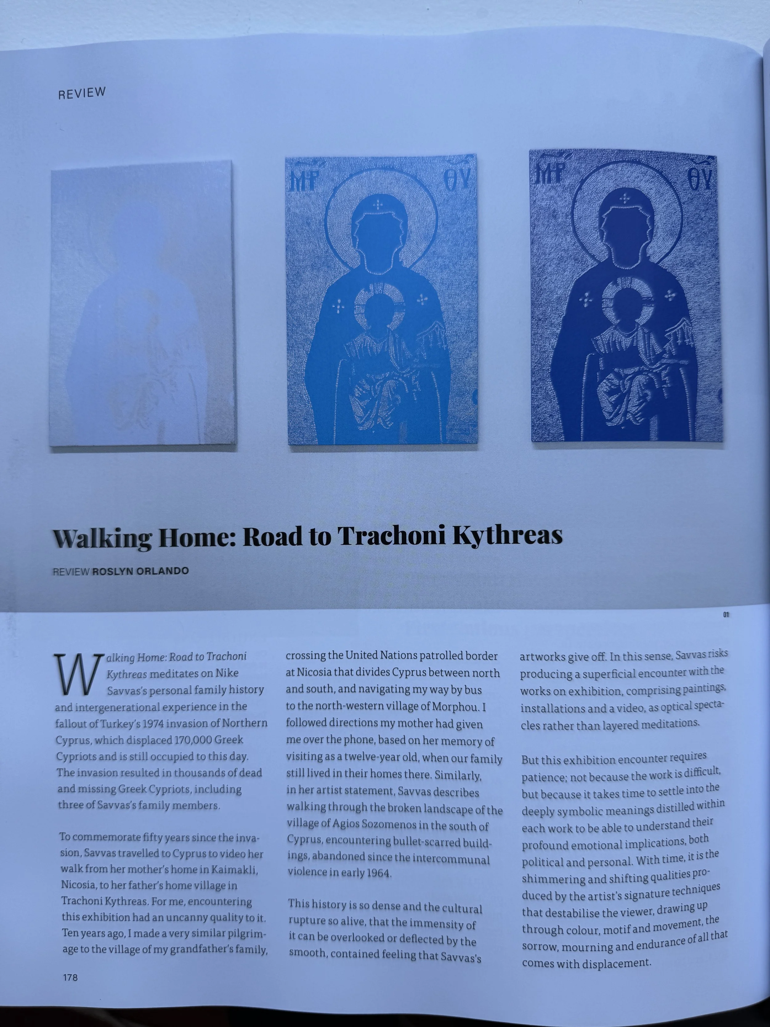 NIKE SAVVAS's latest exhibition 'Walking Home: Road to Trachoni Kythreas' is thoughtfully explored by Roslyn Orlando in the latest issue of Artist Profile - a poignant reflection on the complex layers of history and displacement embedded in the work.